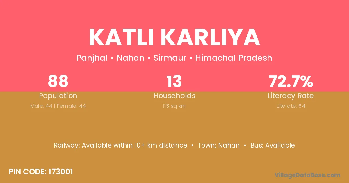 Katli Karliya village has a total population of 88 people, of which 44 are males and 44 are females.