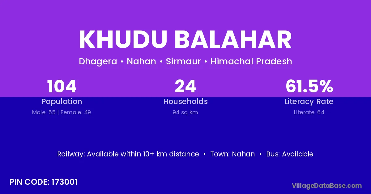 Khudu Balahar village has a total population of 104 people, of which 55 are males and 49 are females.