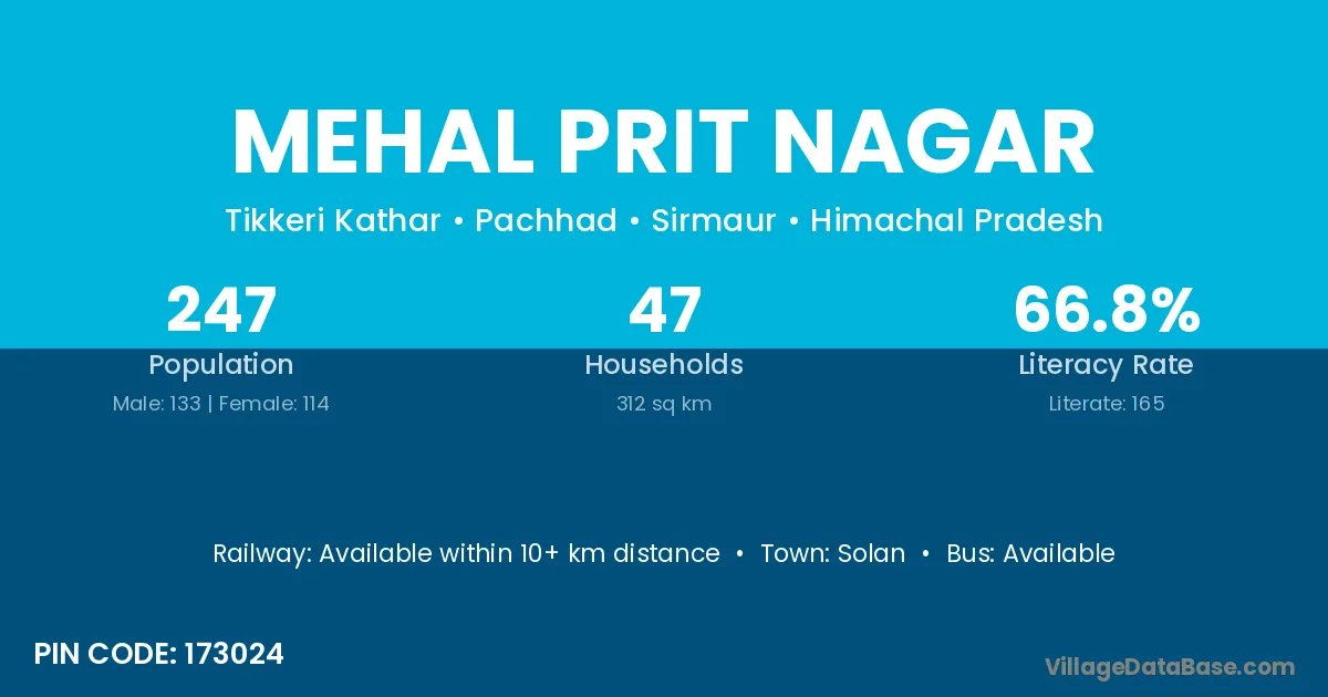 Solan is the nearest town to Mehal Prit Nagar village for major economic activities