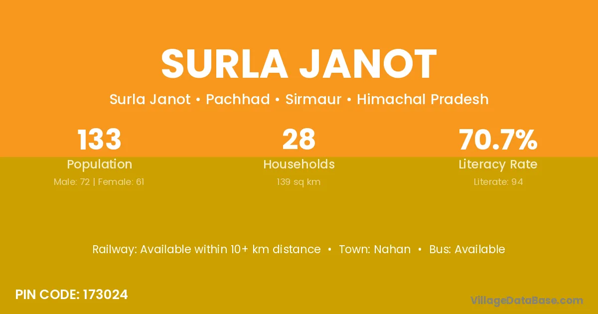 According to Census 2011 information, the village code of Surla Janot village is 173024.