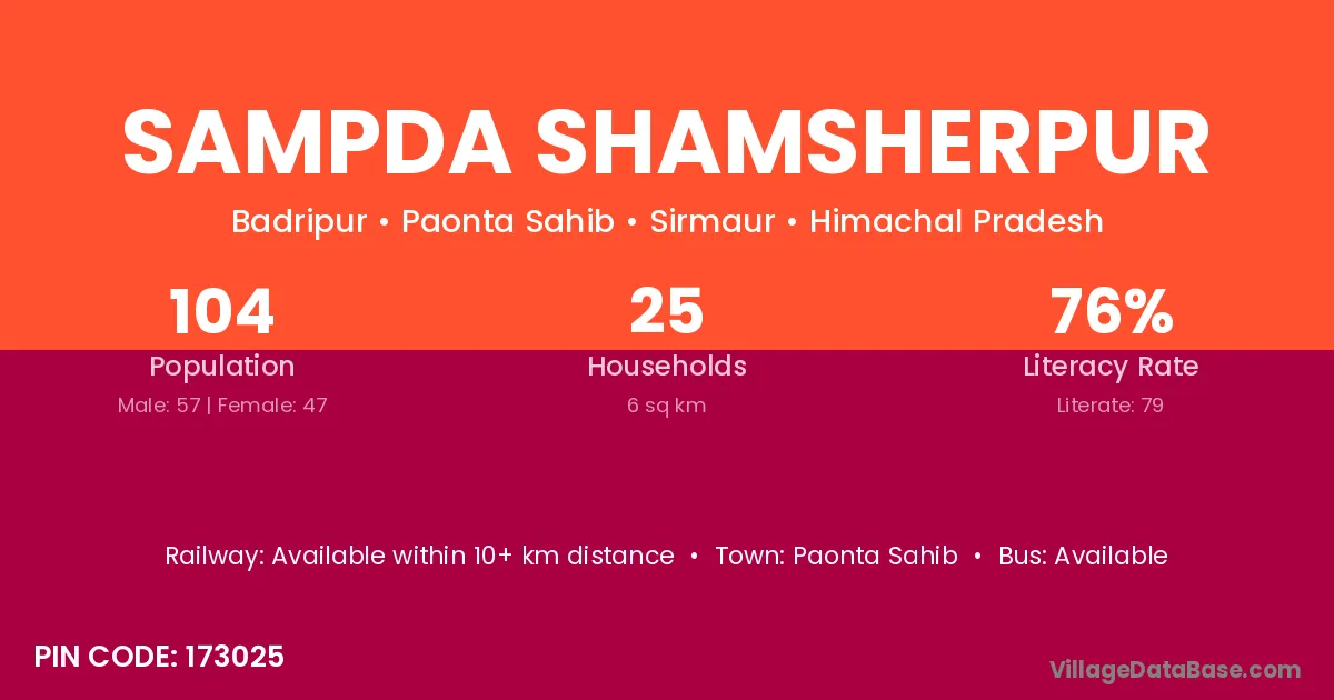 Sampda Shamsherpur village has a total population of 104 people, of which 57 are males and 47 are females.