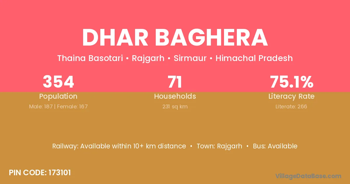 Dhar Baghera village has a total population of 354 people, of which 187 are males and 167 are females.