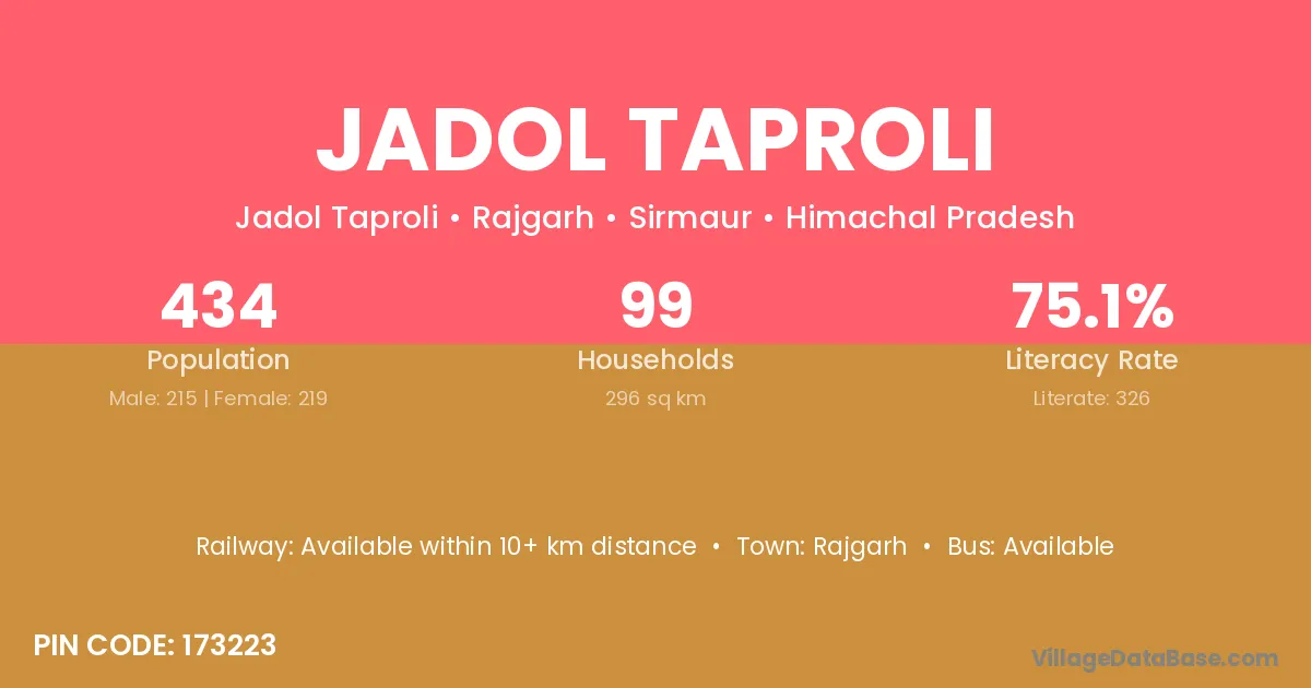 Jadol Taproli village has a total population of 434 people, of which 215 are males and 219 are females.