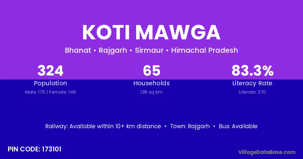 Koti Mawga village has a total population of 324 people, of which 175 are males and 149 are females.