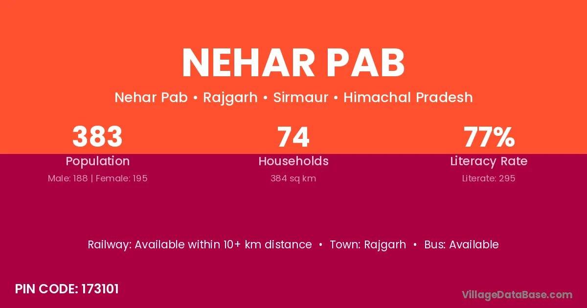 Nehar Pab village has a total population of 383 people, of which 188 are males and 195 are females.