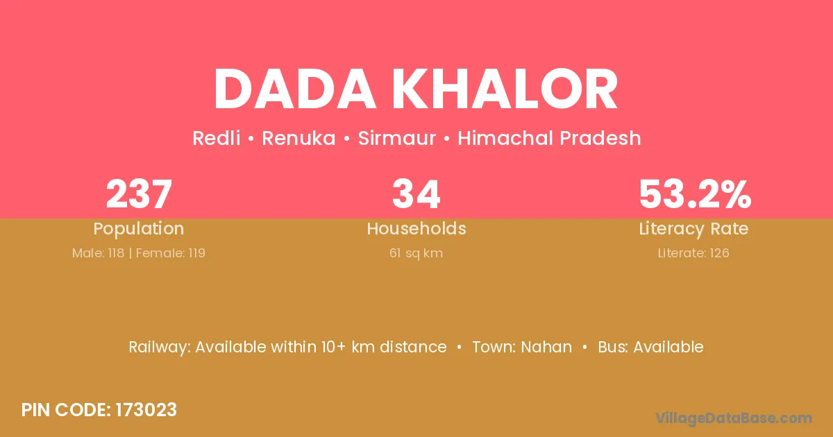 Dada Khalor village has a total population of 237 people, of which 118 are males and 119 are females.