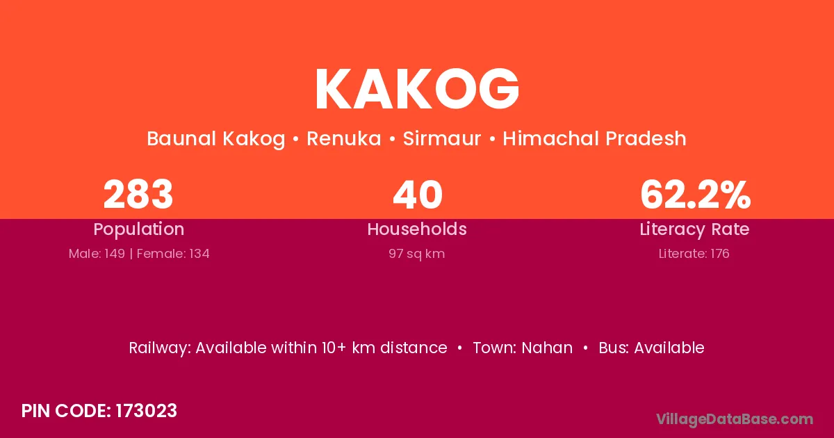 Kakog village has a total population of 283 people, of which 149 are males and 134 are females.