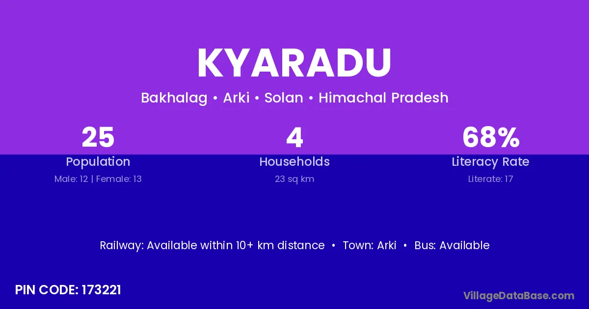 Kyaradu village has a total population of 25 people, of which 12 are males and 13 are females.