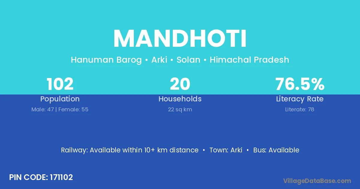 Mandhoti village has a total population of 102 people, of which 47 are males and 55 are females.