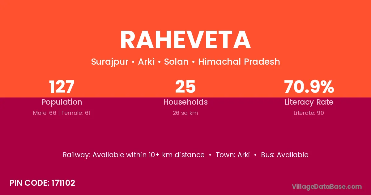 Raheveta village has a total population of 127 people, of which 66 are males and 61 are females.