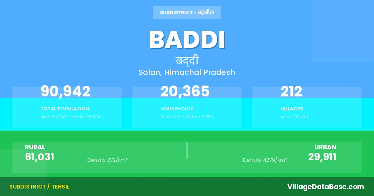 According to the 2011 census The total area of Baddi Tehsil is 232 km², with a population of 90942 people. The population density is 393 inhabitants per square kilometre, and there are approximately 20365 houses in the sub district.