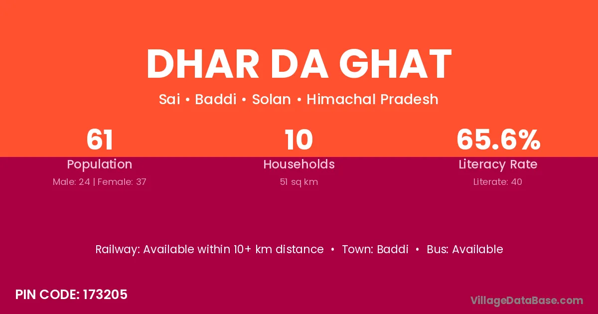 Dhar Da Ghat village has a total population of 61 people, of which 24 are males and 37 are females.