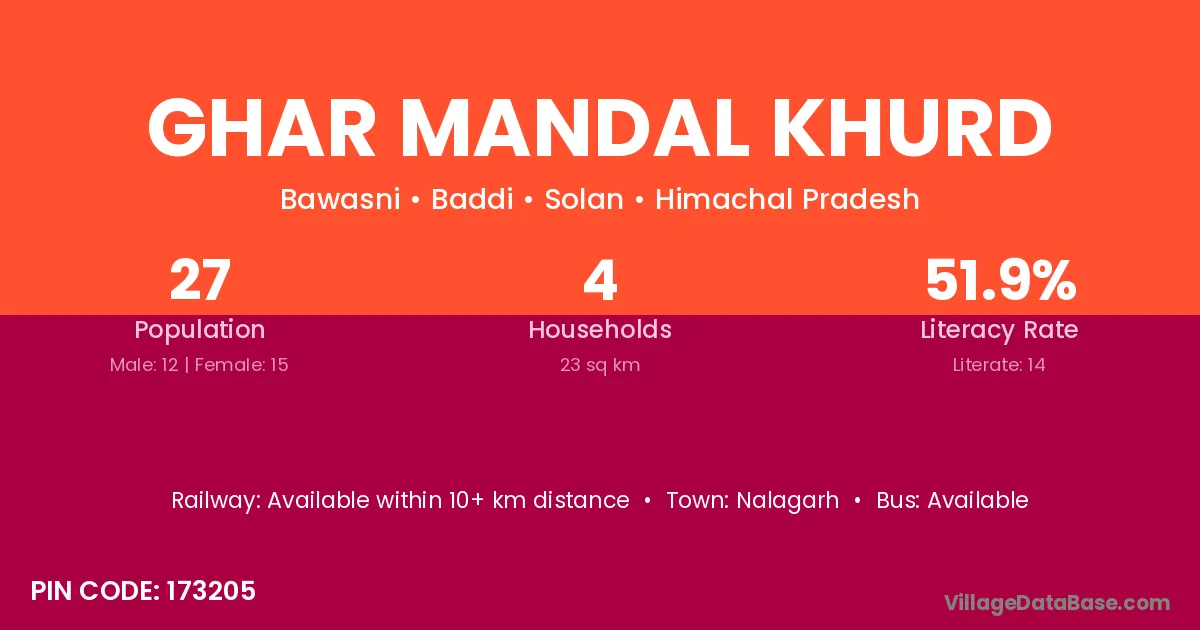 Ghar Mandal Khurd village has a total population of 27 people, of which 12 are males and 15 are females.