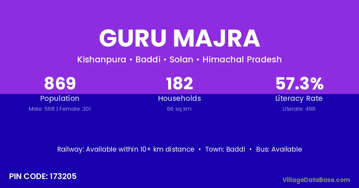 Guru Majra village has a total population of 869 people, of which 568 are males and 301 are females.