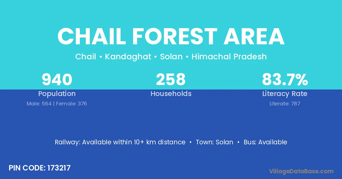 Chail Forest Area village has a total population of 940 people, of which 564 are males and 376 are females.