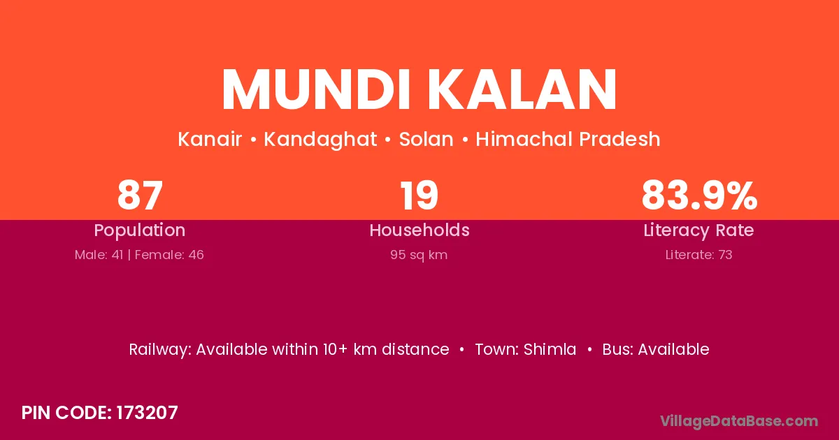 Mundi Kalan village has a total population of 87 people, of which 41 are males and 46 are females.