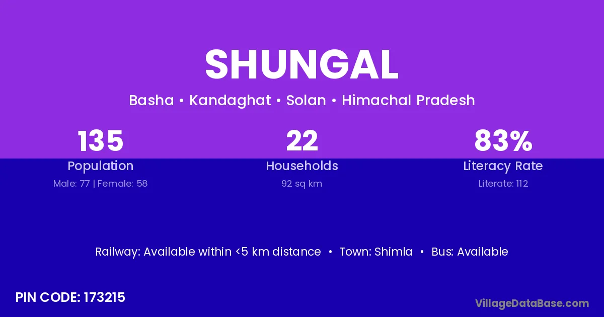 Shungal village has a total population of 135 people, of which 77 are males and 58 are females.