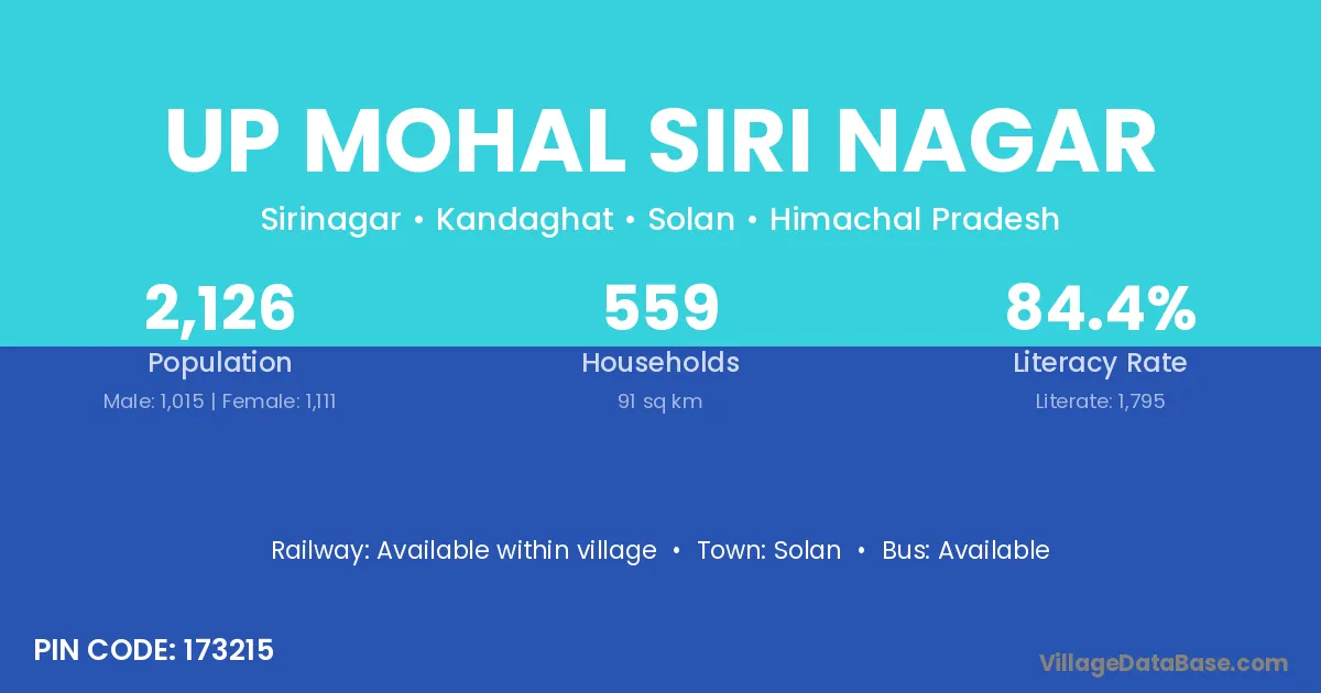 Solan is the nearest town to Up Mohal Siri Nagar village for major economic activities