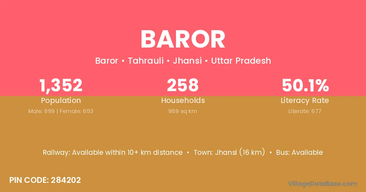 The literacy rate of Baror village is 62.65%. Male literacy stands at 74.47% and female literacy at 47.22%.