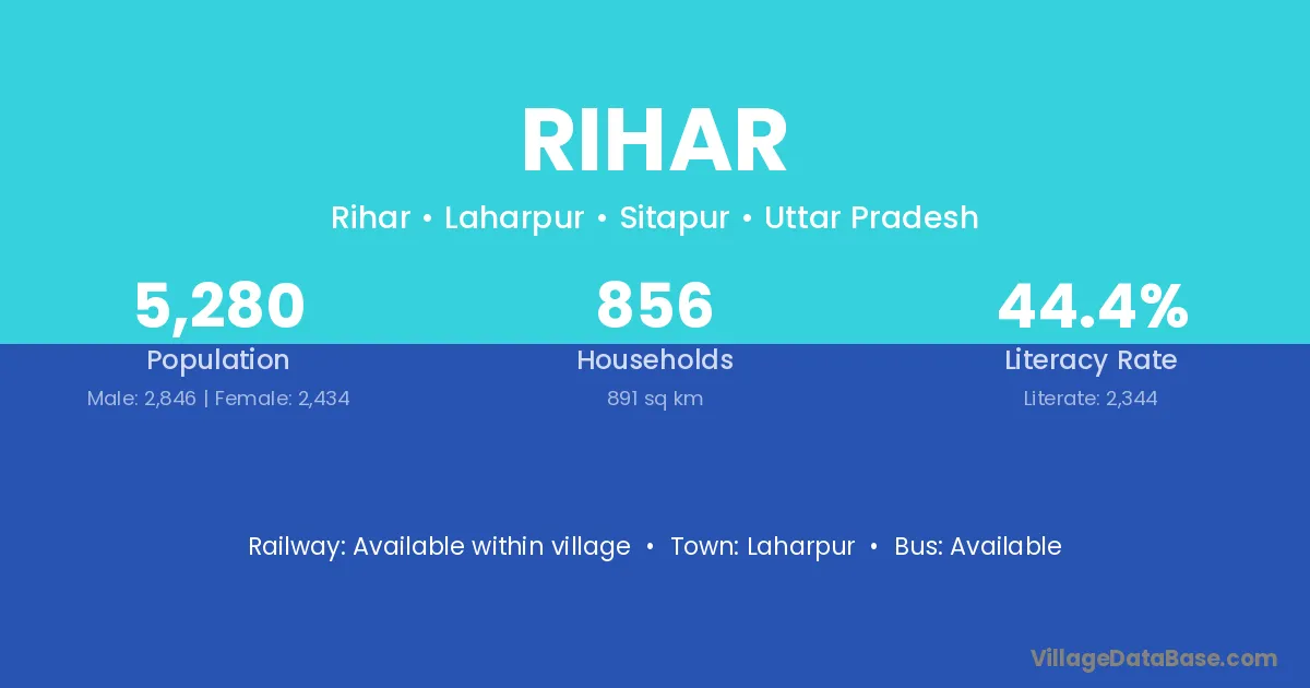The literacy rate of Rihar village is 81.36%. Male literacy stands at 81.48% and female literacy at 81.25%.