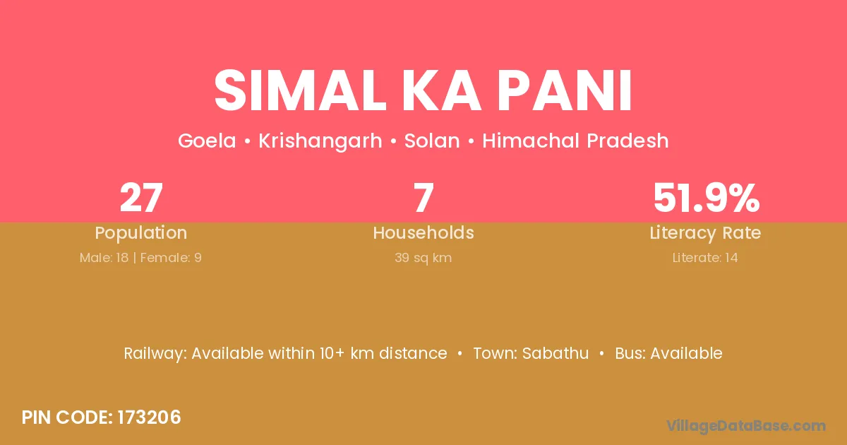 Simal Ka Pani village has a total population of 27 people, of which 18 are males and 9 are females.