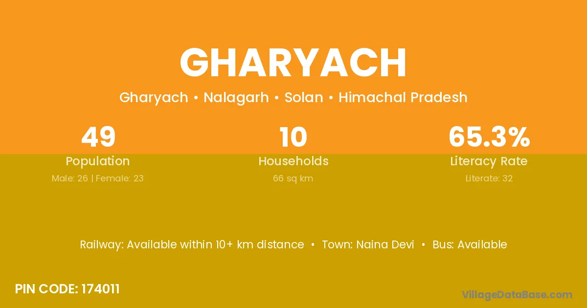 Gharyach village has a total population of 49 people, of which 26 are males and 23 are females.