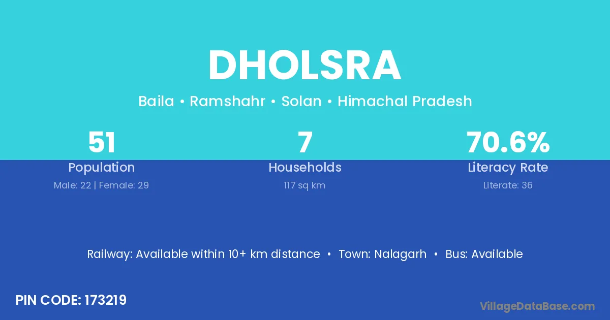 Dholsra village has a total population of 51 people, of which 22 are males and 29 are females.