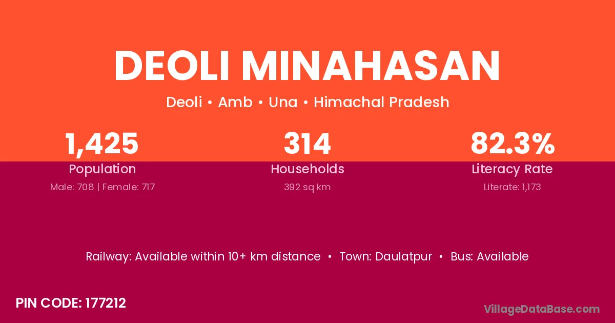 Deoli Minahasan village has a total population of 1,425 people, of which 708 are males and 717 are females.