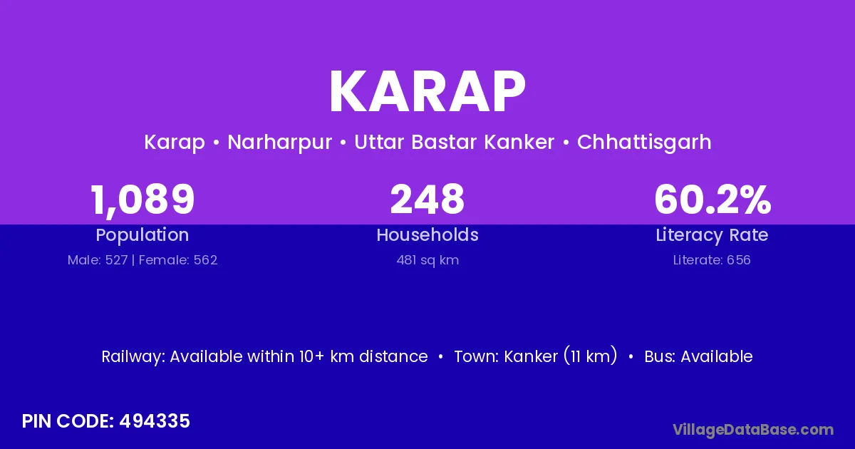 The literacy rate of Karap village is 81.66%. Male literacy stands at 87.18% and female literacy at 75.89%.