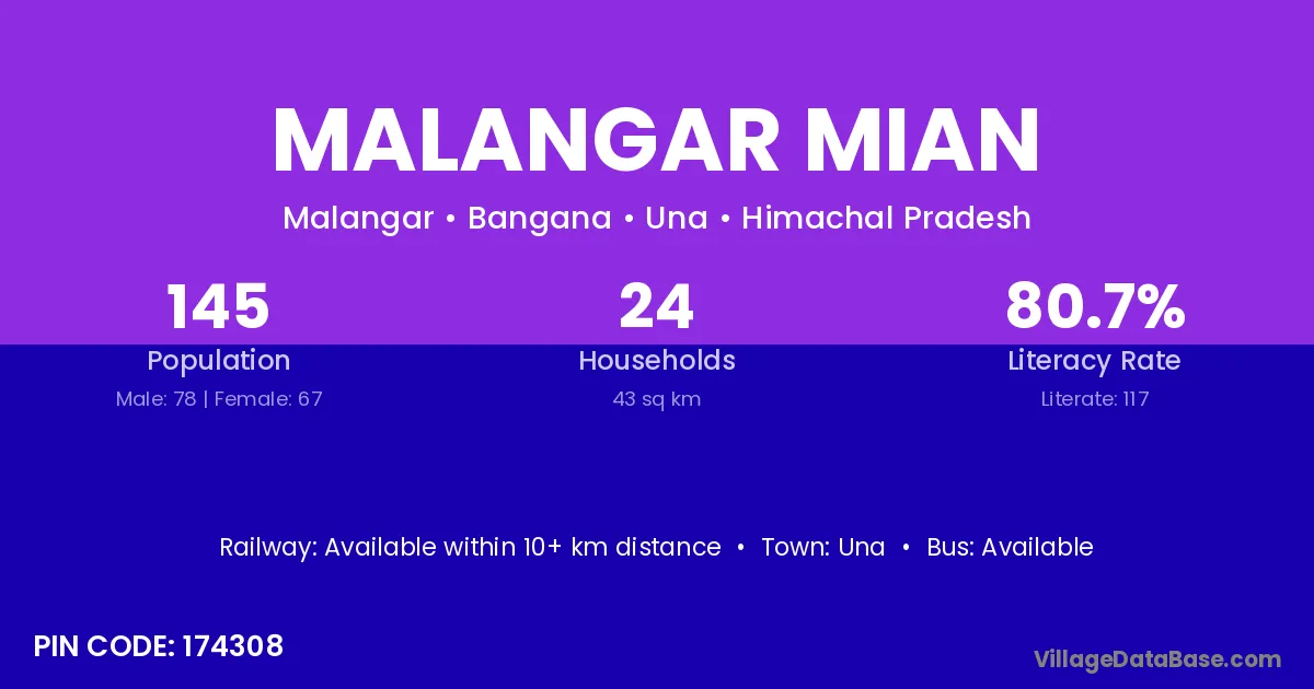Malangar Mian village has a total population of 145 people, of which 78 are males and 67 are females.