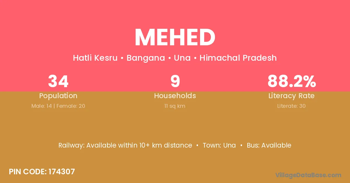 Mehed village has a total population of 34 people, of which 14 are males and 20 are females.