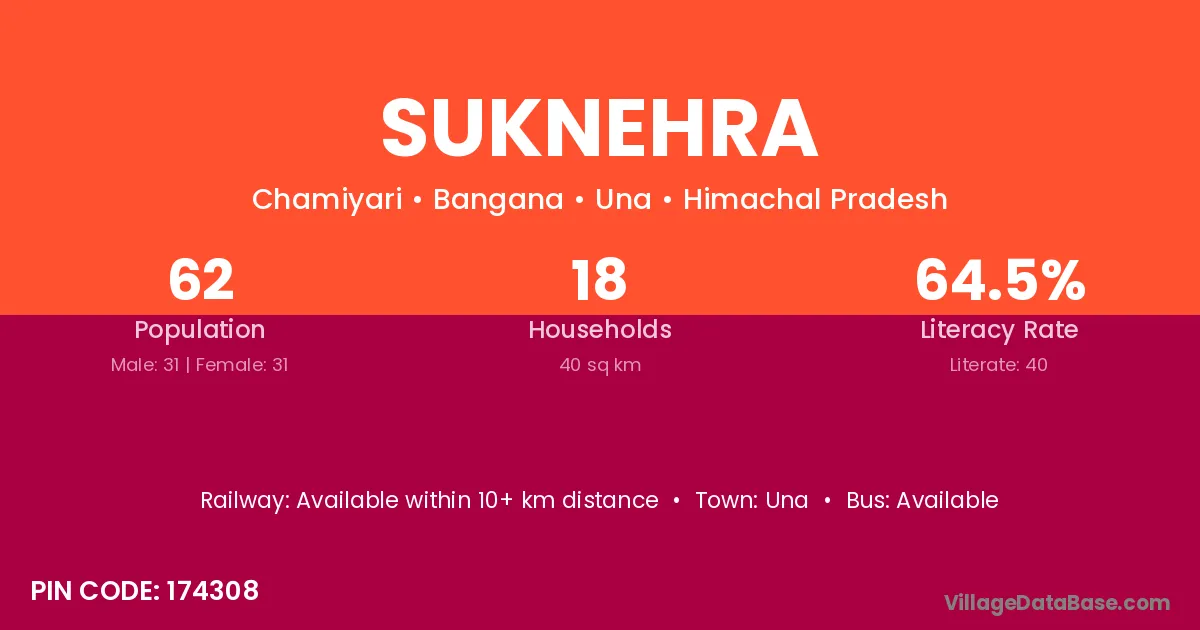 Suknehra village has a total population of 62 people, of which 31 are males and 31 are females.