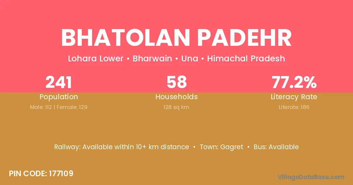 Bhatolan Padehr village has a total population of 241 people, of which 112 are males and 129 are females.