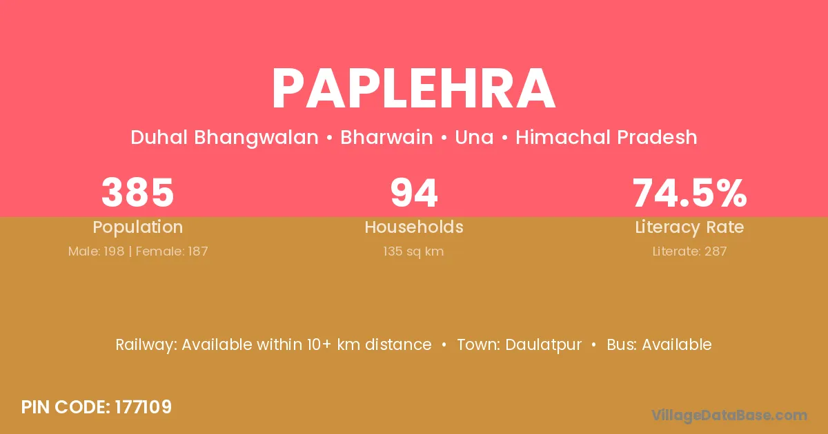 Paplehra village has a total population of 385 people, of which 198 are males and 187 are females.