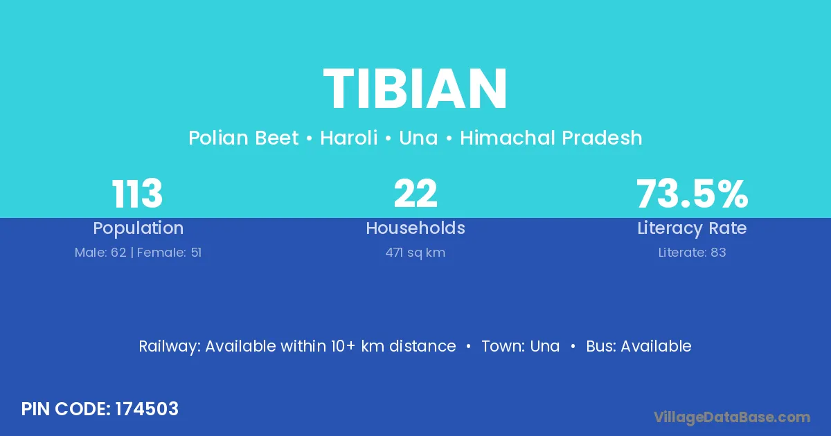 Tibian village has a total population of 113 people, of which 62 are males and 51 are females.