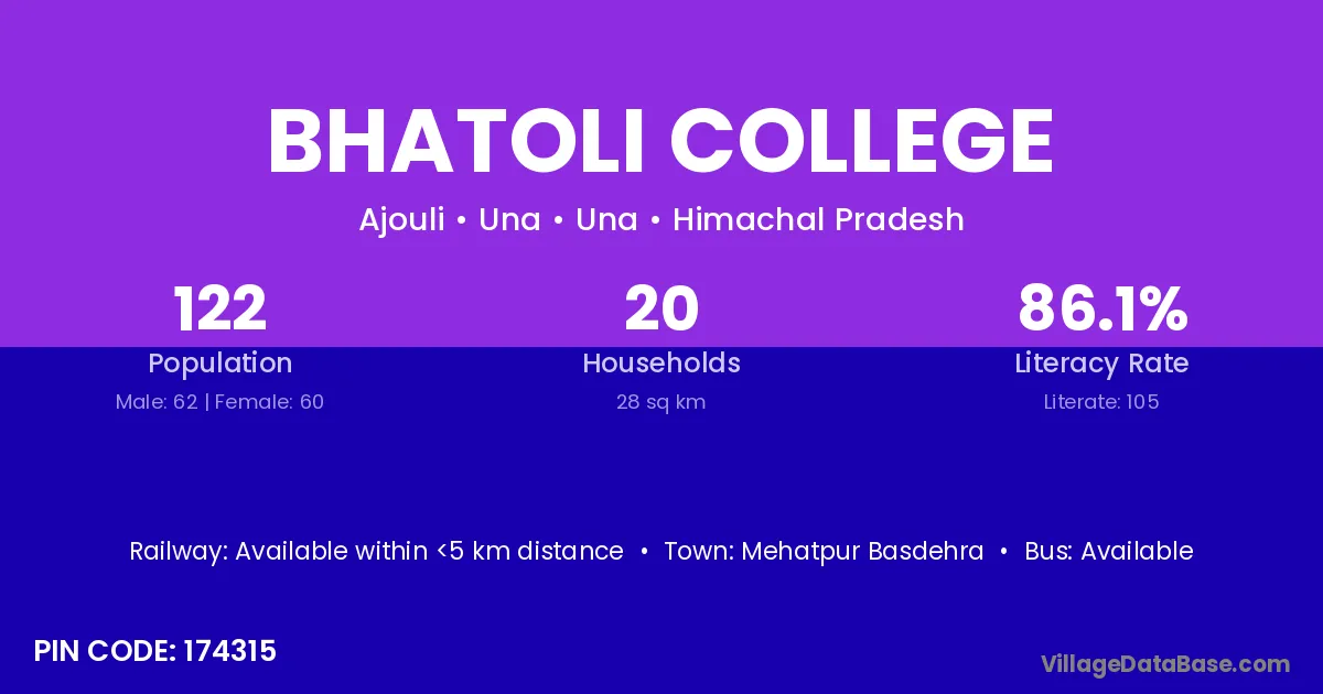 Bhatoli College village has a total population of 122 people, of which 62 are males and 60 are females.