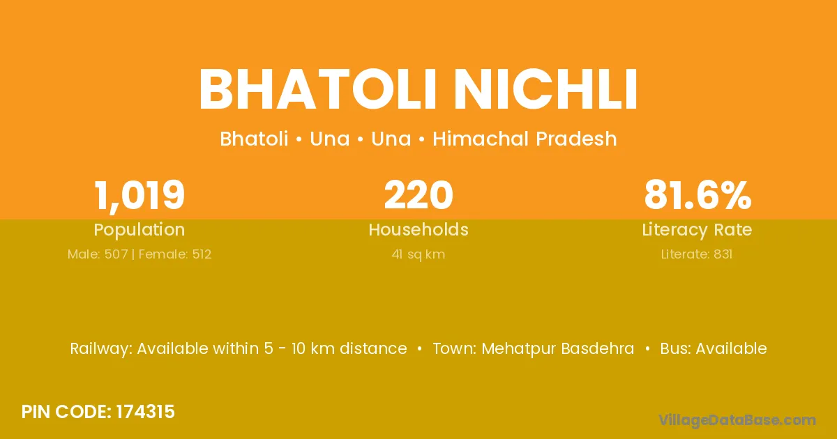 Bhatoli Nichli village has a total population of 1,019 people, of which 507 are males and 512 are females.