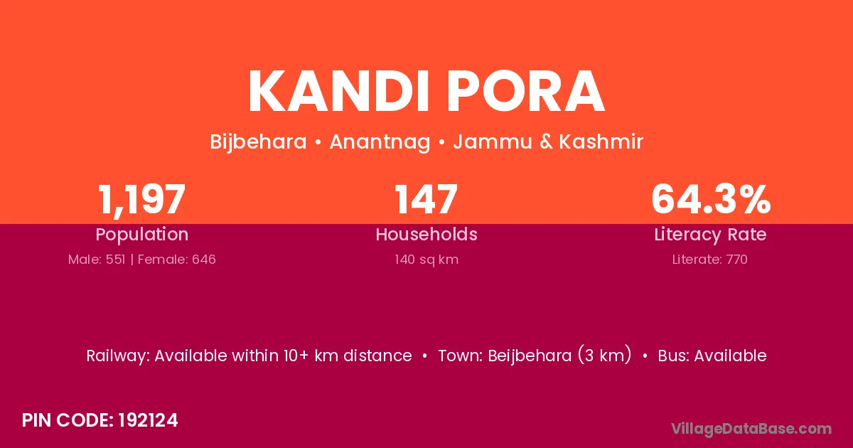 Kandi Pora village has a total population of 1,197 people, of which 551 are males and 646 are females.
