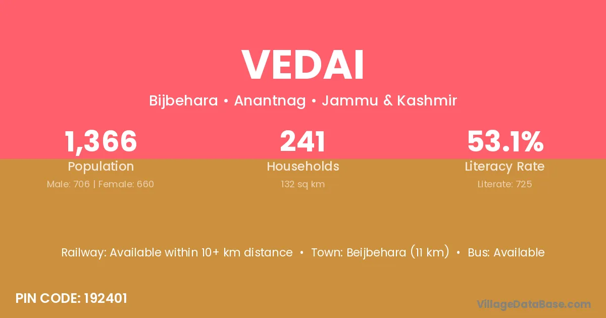 According to Census 2011 information, the village code of Vedai village is 192401.