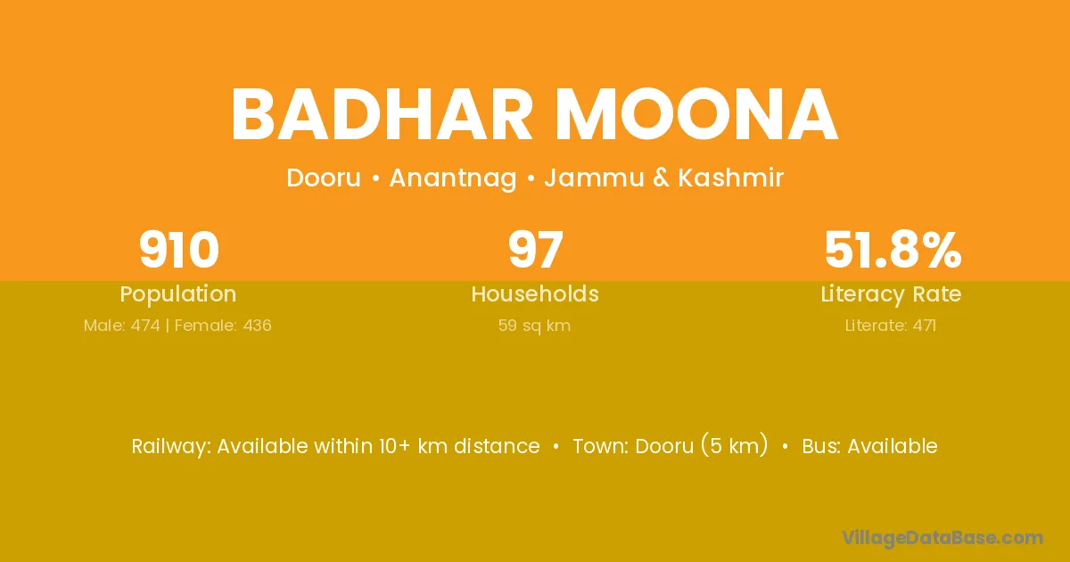 Badhar Moona village has a total population of 910 people, of which 474 are males and 436 are females.