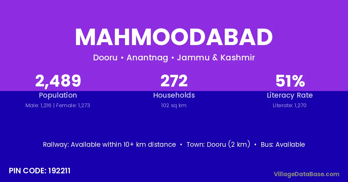 Dooru (2 km) is the nearest town to Mahmoodabad village for major economic activities and is located approximately 2 km away.