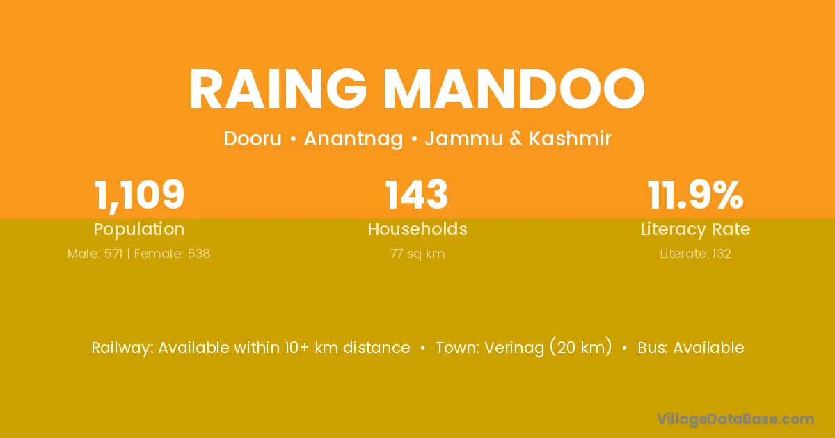 Verinag (20 km) is the nearest town to Raing Mandoo village for major economic activities and is located approximately 20 km away.