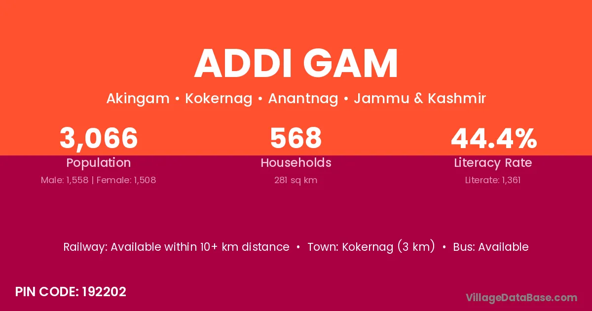 Kokernag (3 km) is the nearest town to Addi Gam village for major economic activities and is located approximately 3 km away.