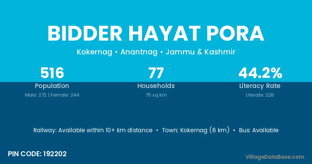 Kokernag (6 km) is the nearest town to Bidder Hayat Pora village for major economic activities and is located approximately 6 km away.