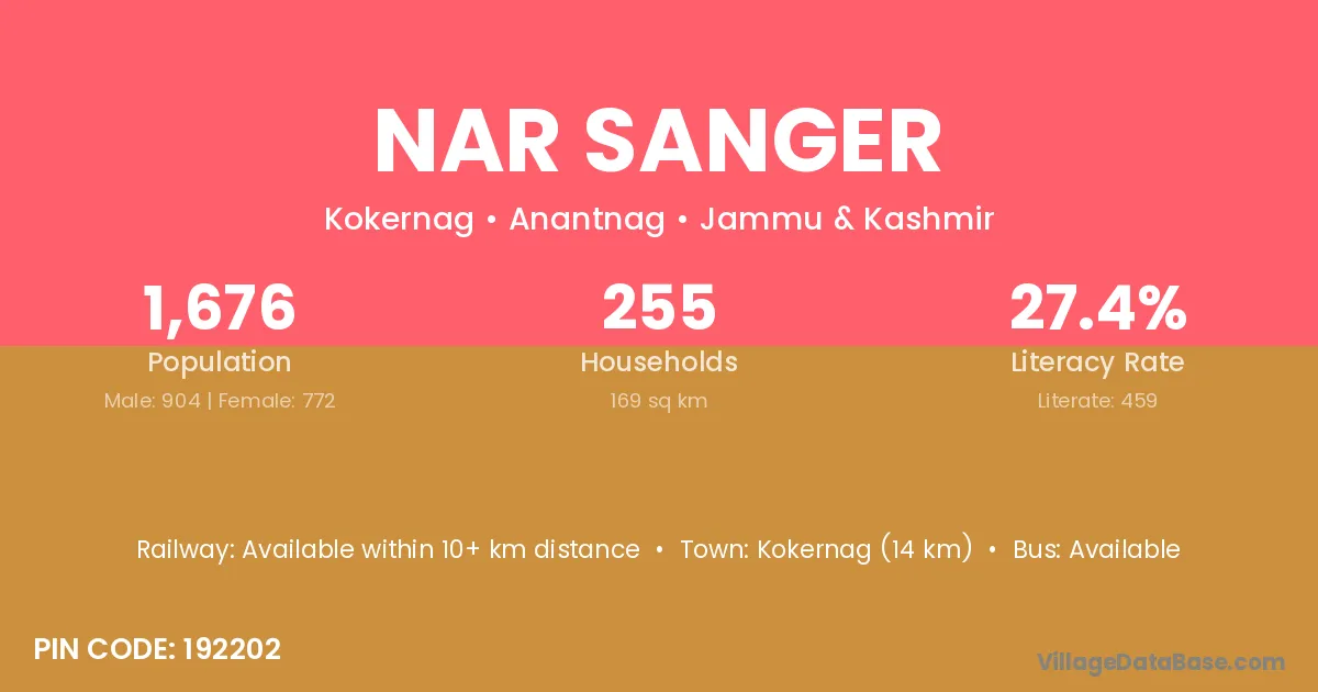 Kokernag (14 km) is the nearest town to Nar Sanger village for major economic activities and is located approximately 14 km away.