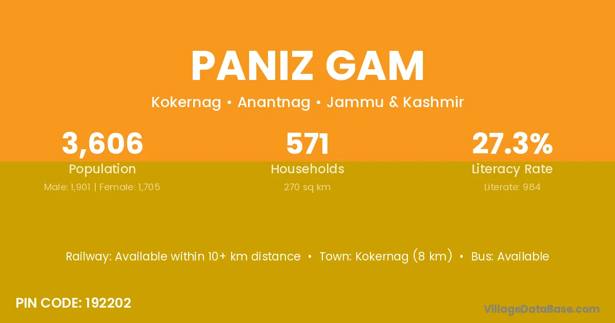 Kokernag (8 km) is the nearest town to Paniz Gam village for major economic activities and is located approximately 8 km away.