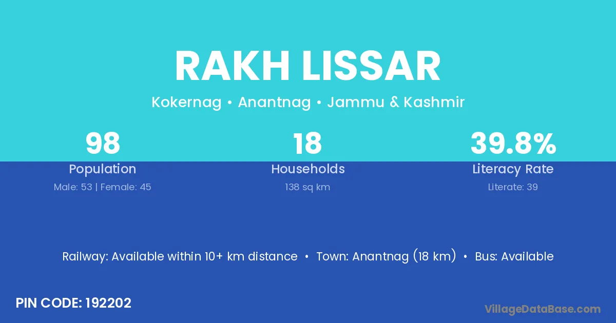 Anantnag (18 km) is the nearest town to Rakh Lissar village for major economic activities and is located approximately 18 km away.