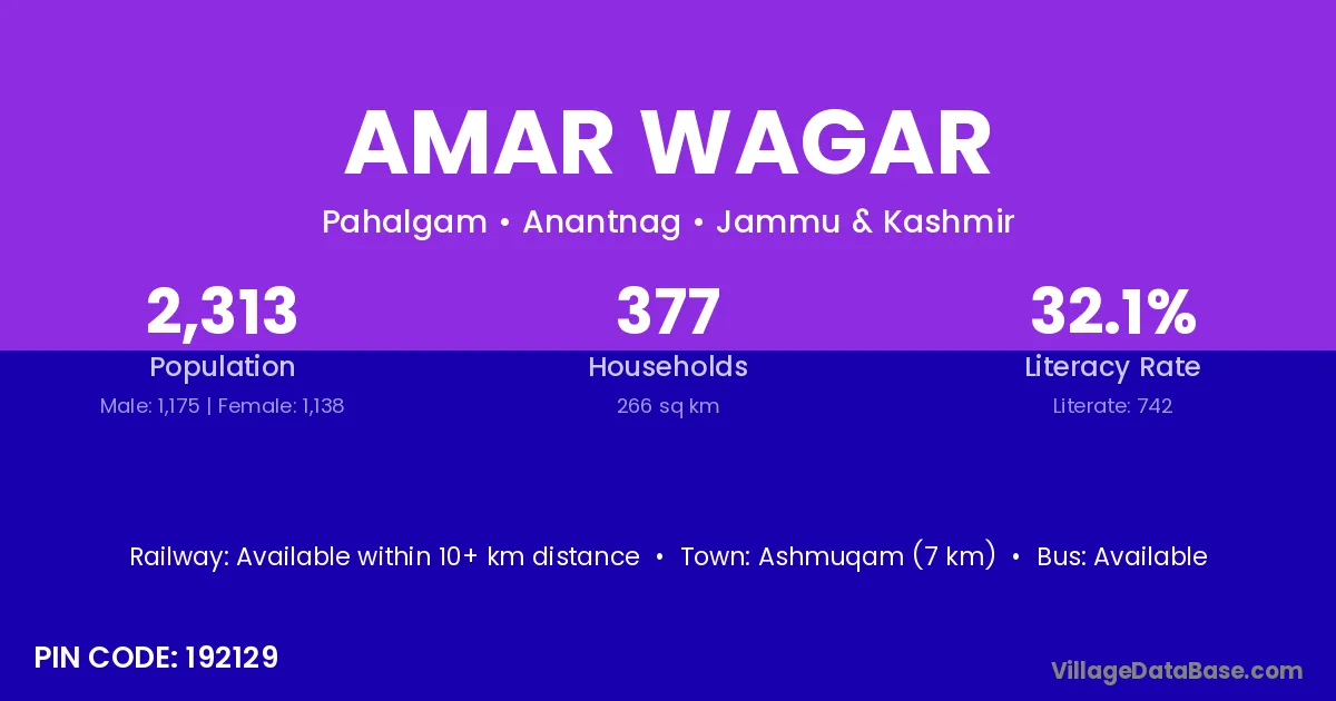 Ashmuqam (7 km) is the nearest town to Amar Wagar village for major economic activities and is located approximately 7 km away.