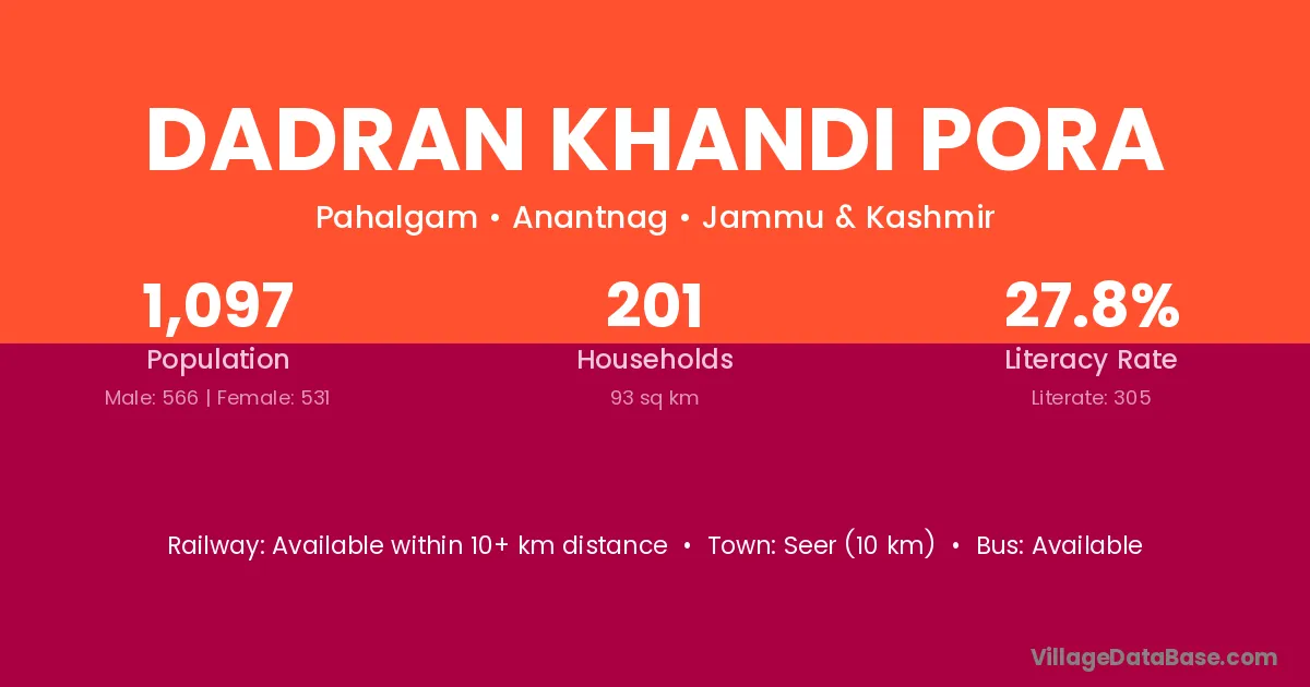 Seer (10 km) is the nearest town to Dadran Khandi Pora village for major economic activities and is located approximately 10 km away.