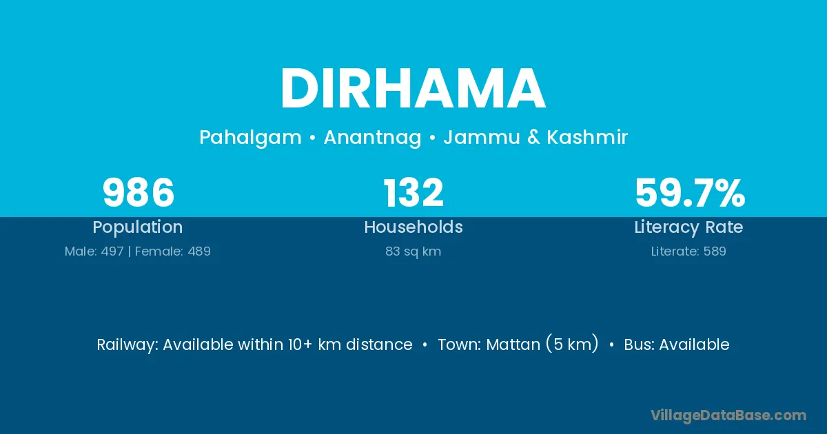 Dirhama village has a total population of 986 people, of which 497 are males and 489 are females.